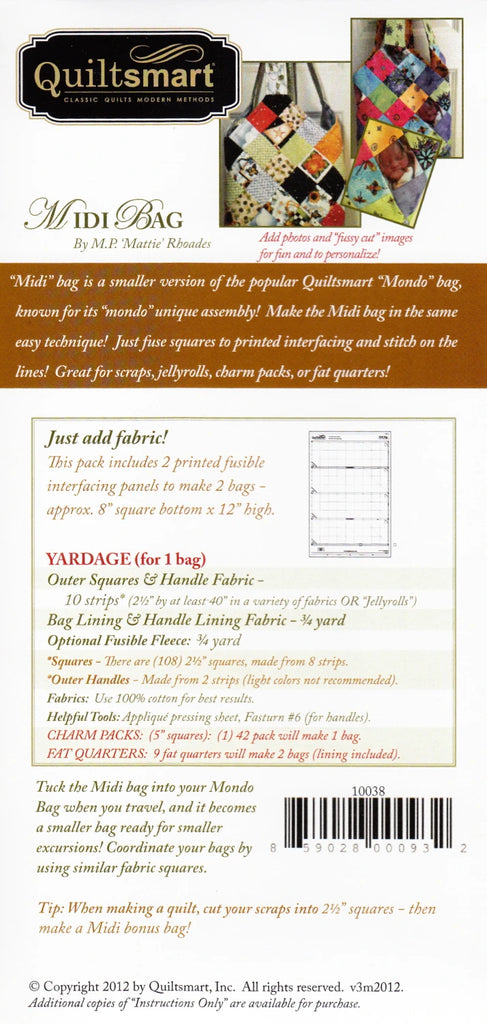 The Midi Bag Fun Pack Includes 2 Panels of Midi Bag Interfacing and the Pattern. Makes 2 Bags. This is a Fun Quick Project, finished bag is 8in x 8in x 12in.