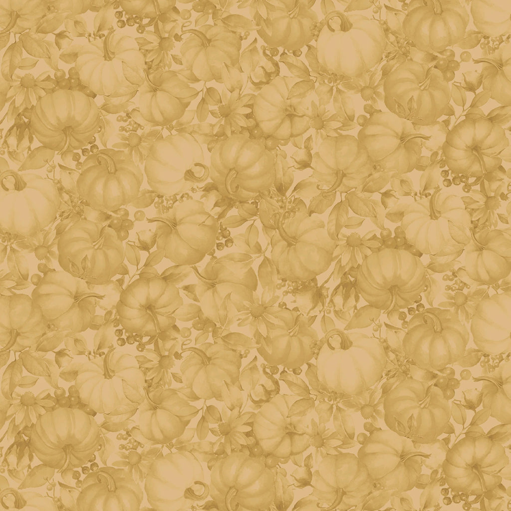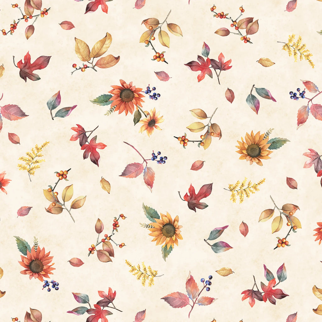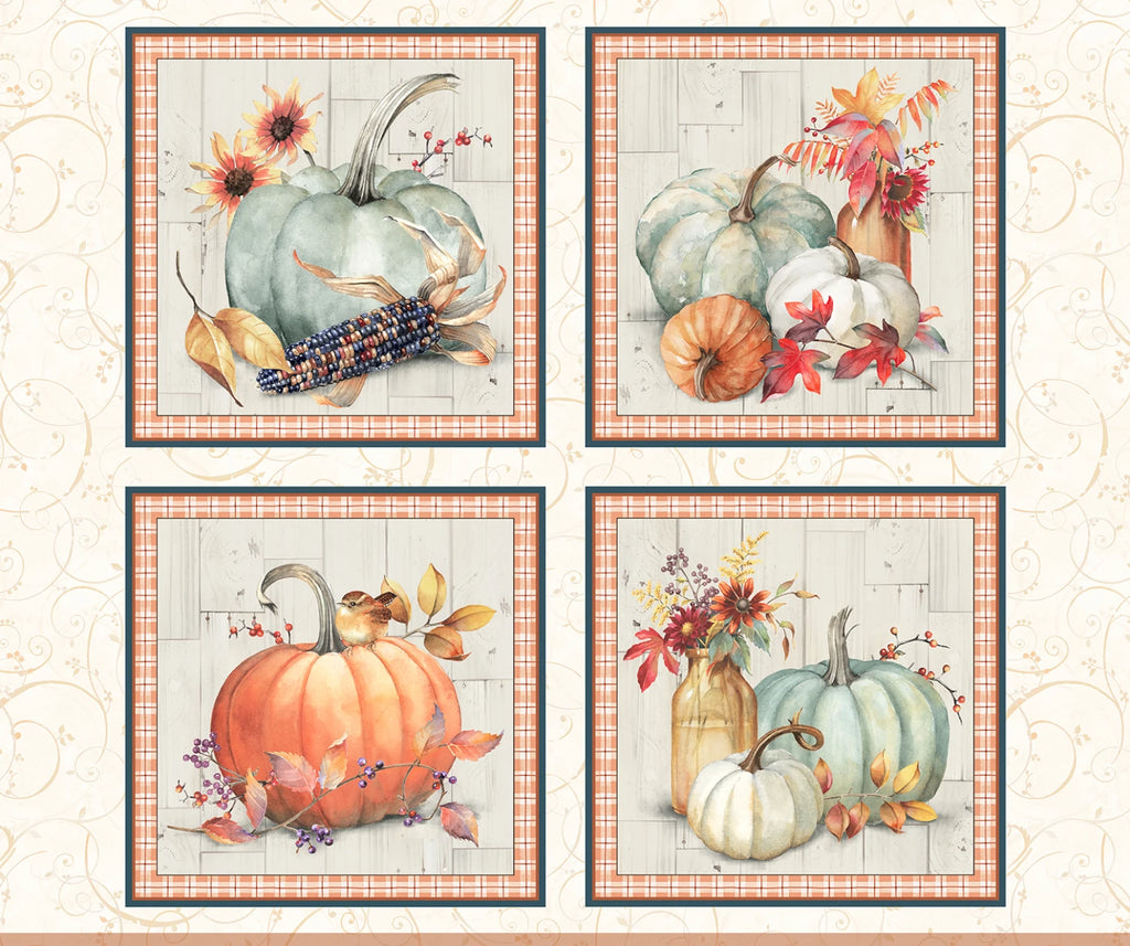 This fabric & panel features a charming autumnal design with four distinct squares, each showcasing different harvest elements. The top left square displays a large pumpkin with sunflowers, Indian corn, and fall leaves. Adjacent to it, the top right square presents a variety of pumpkins surrounded by vibrant autumn flowers. The bottom left square features a bright orange pumpkin with a perched bird, autumn leaves, and berries. Lastly, the bottom right square shows a collection of pumpkins and gourds with a vase of fall foliage. The design is framed with a delicate orange and white checkered border, adding a rustic touch to this seasonal fabric.