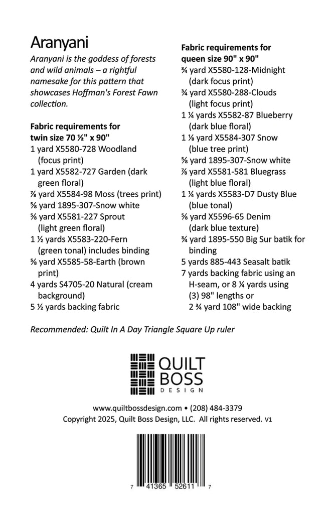 Aranyani is the goddess of forests and wild animals – a rightful namesake for this pattern that showcases Hoffman's Forest Fawn collection. The pattern shows two colorways, in two sizes. The twin size is 7- 1/2" x 90" and the queen size is 90" x 90".